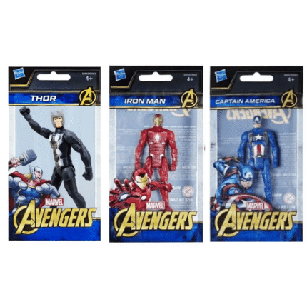 Esta incrível Edição de Colecionadores traz mini bonecos detalhados dos Vingadores Thor, Homem de Ferro e Capitão América, perfeitos para fãs e colecionadores da Marvel.