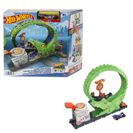 Com a Hot Wheels City Pista Ataque do Crocodilo, a diversão está garantida! Desafie-se a derrotar o crocodilo e salvar a pizzaria com manobras incríveis. Prepare-se para horas de diversão e aventura!
