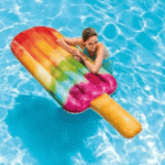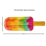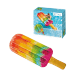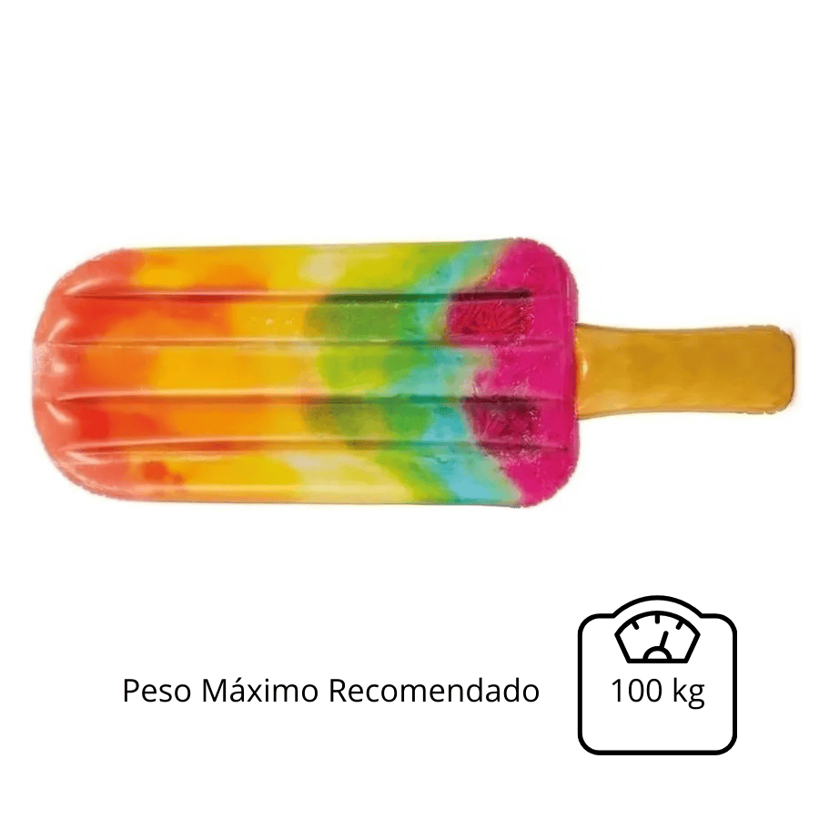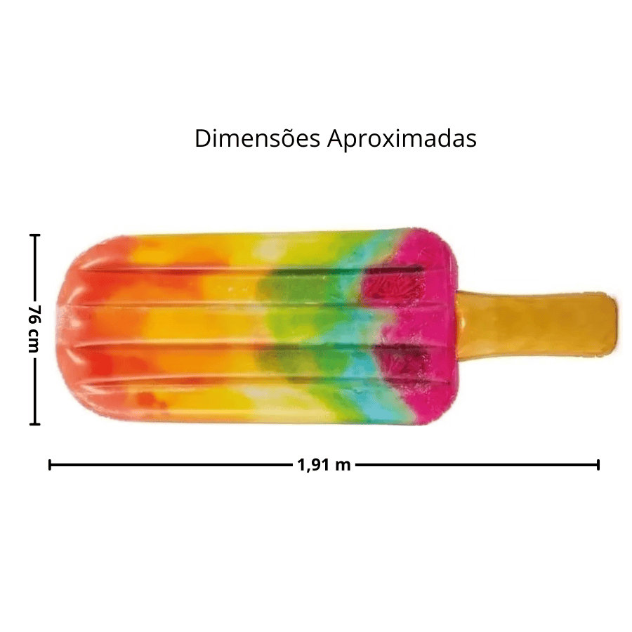 Tem a forma de picolé e as cores rosa, verde, azul, amarelo laranja, tudo super colorido! Tem um aspecto incrível e muito refrescante!  É resistente à água salgada e ao cloro, pelo que o poderá utilizar tanto na praia como na piscina.