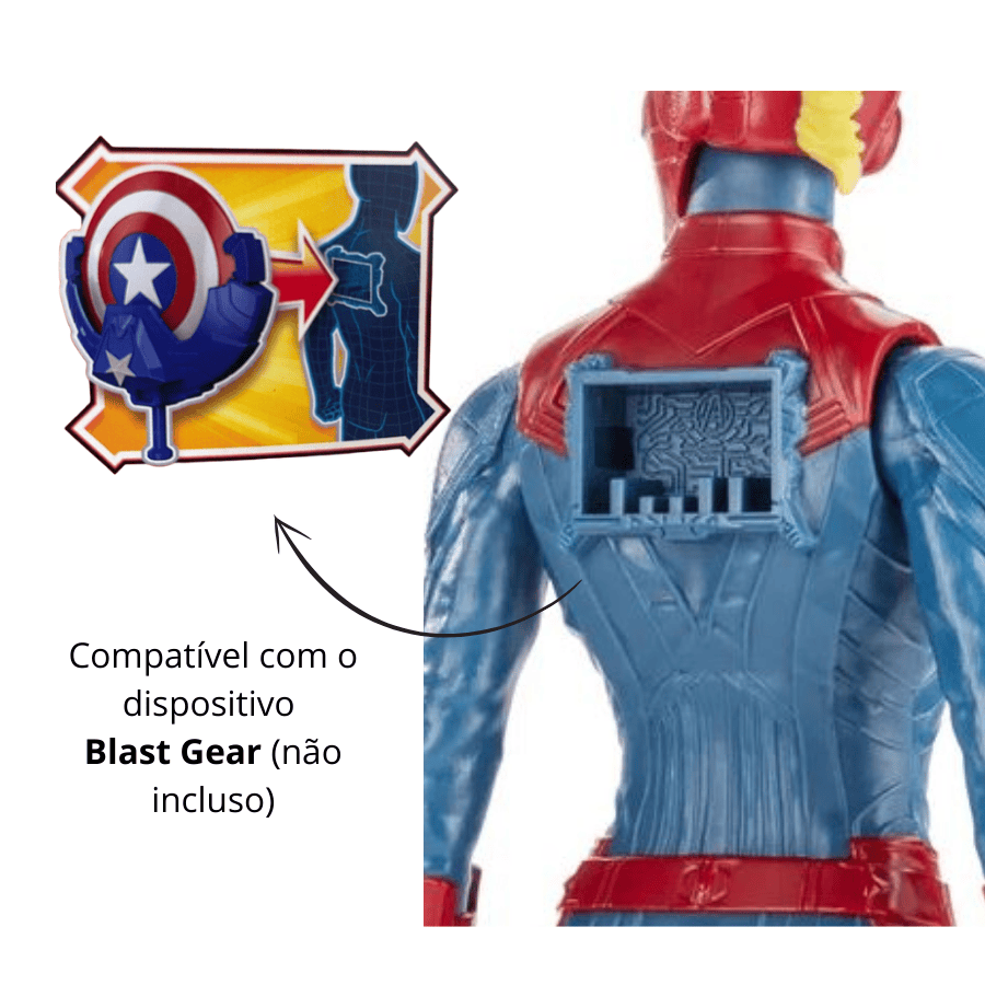 Com o design inspirado no filme Vingadores o ultimato, Boneca Capitã Marvel Séries Vingadores permite recriar as cenas preferidas dos filmes da Marvel. Esta figura vem com um compartimento para o pacote Titan Hero Power Fx (não incluído; vendido separadamente com figuras do Titan Hero Power Fx), então quando as crianças conectam o pacote, elas podem ativar sua figura e ativar sons e frases específicos do personagem de Avengers. Entre nessa aventura com a Boneca Capitã Marvel Séries Vingadores  da Hasbro!