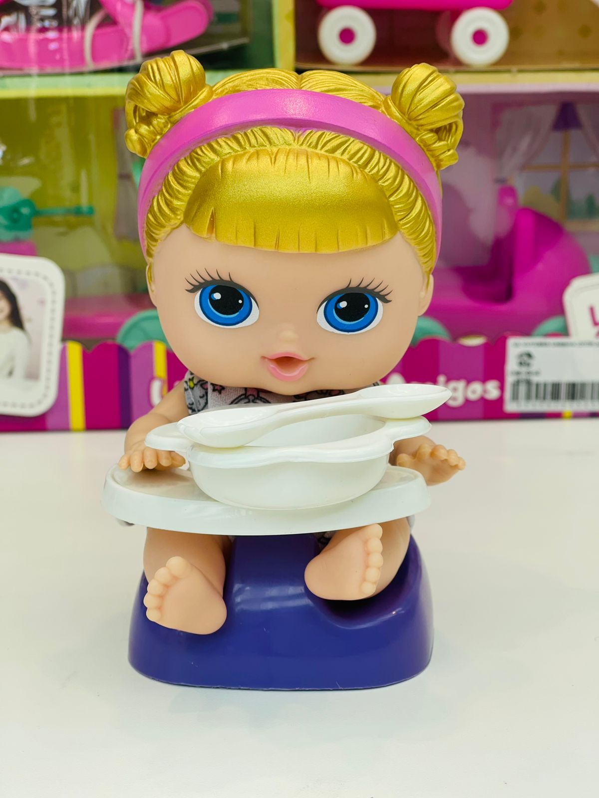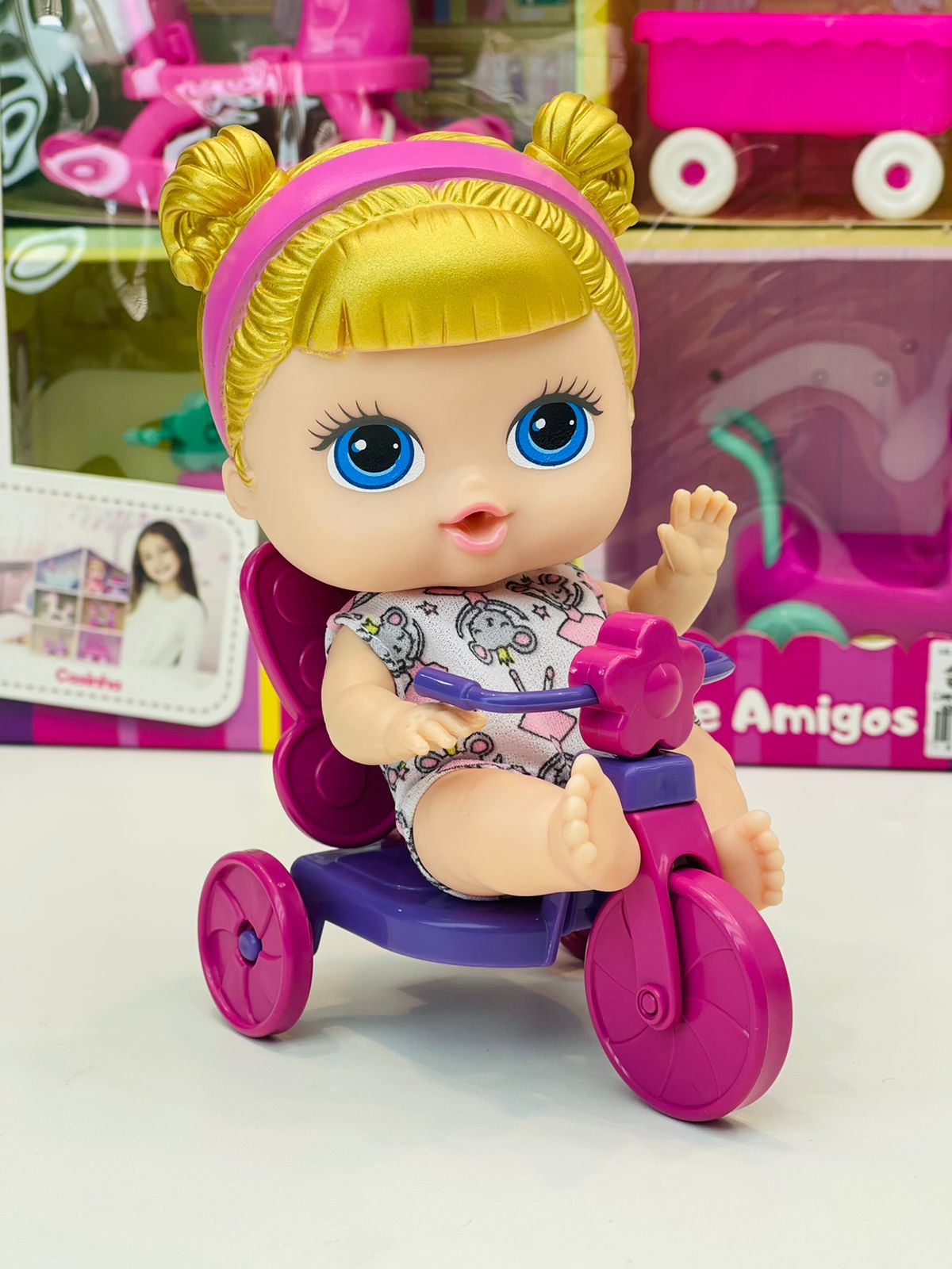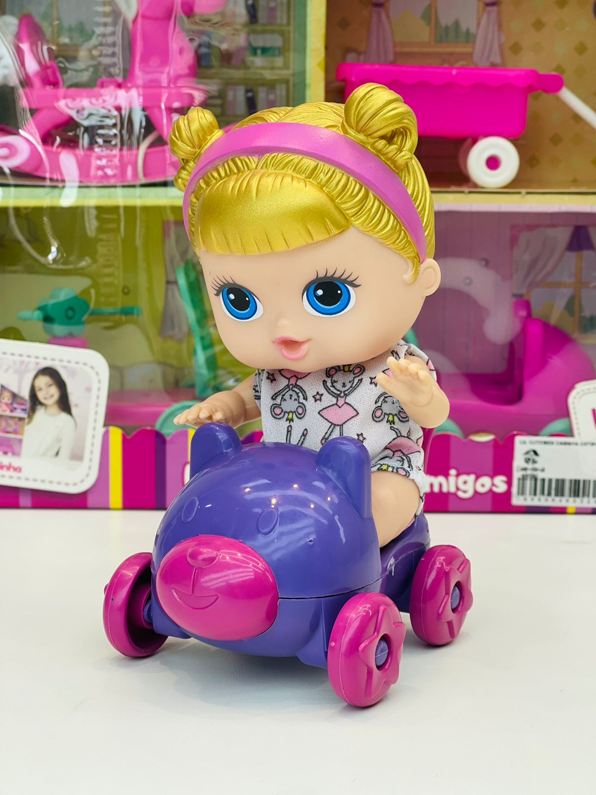 Esse brinquedo adorável vem com uma bonequinha loira super fofa e macia e diversos acessórios, ideal para passeios imaginários cheios de aventuras.