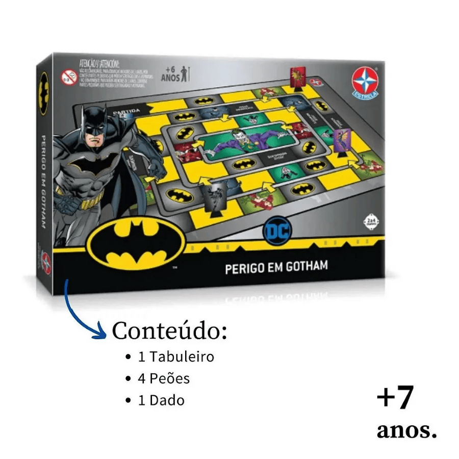 Chame os seus amigos e se divirta com o Jogo Batman Perigo em Gotham City da Estrela! Jogos de tabuleiro são um verdadeiro sucesso para todas as idades. No jogo do Perigo em Gotham City do Batman, os pequenos desenvolvem o raciocínio lógico e estratégias, enquanto a diversão rola solta. A mecânica do jogo é simples: você precisa passar por todas as casas e seus desafios. No final, precisa derrotar o Coringa, vilão mais famoso do homem morcego!